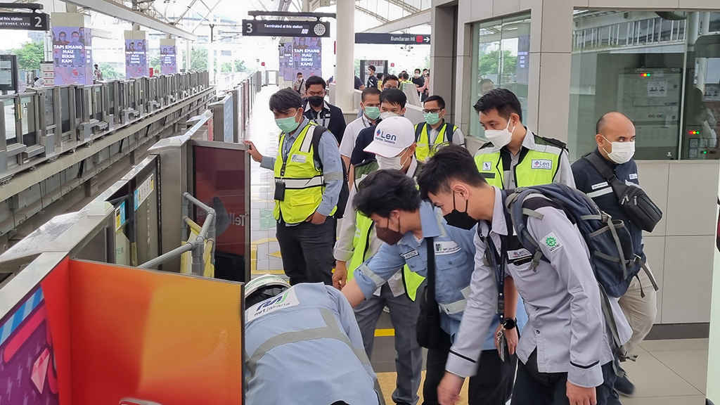 Jakarta August 2, 2022 PT Len Rekaprima Semesta attended MRTJ's invitation for the Management Walkthrough. The first activity, in the Meeting Room of the Bundaran HI MRT Station, PT Len Rekaprima Semesta and MRTJ held discussions regarding PSD issues that occurred in the field. Both parties are committed to working together in accelerating handling of these issues. The next activity was a direct review of the equipment location from the MRTJ PSD device, where the issue occurred and discussed the steps to be taken in dealing with the issue.
